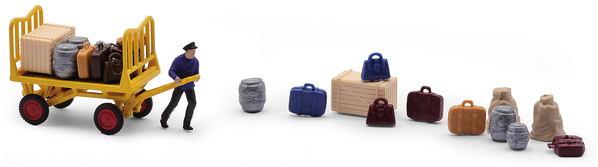 Un employé des chemins de fer charge un chariot de quai de valises, de sacs et de barils.