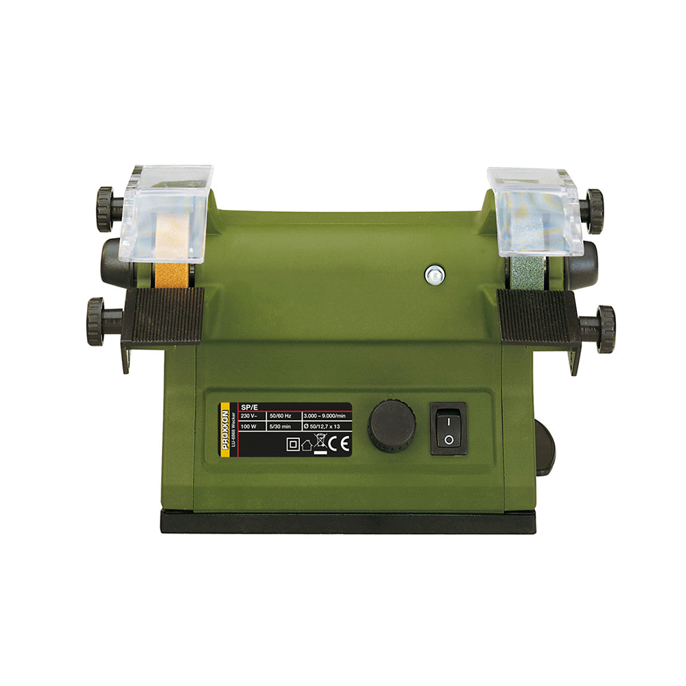 Livrée avec une meule de 50 x 13mm en corindon(durée N) pour le ponçage et affûtage et une meule en carbure de silicium (composition plus douce) pour matières très dures.