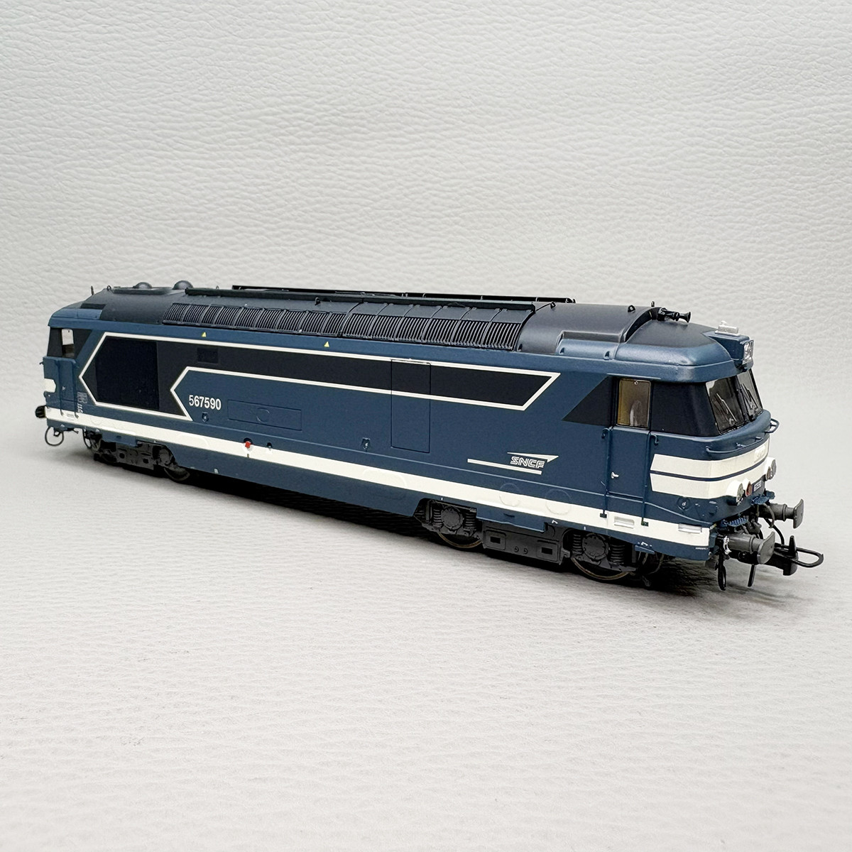 - Modèle réel : La locomotive diesel BB 67590 est présentée avec une livrée bleue d'origine avec le logo Casquette et Carmillon. Pas de nom de dépôt. Utilisée Par la société des chemins de fer français SNCF.