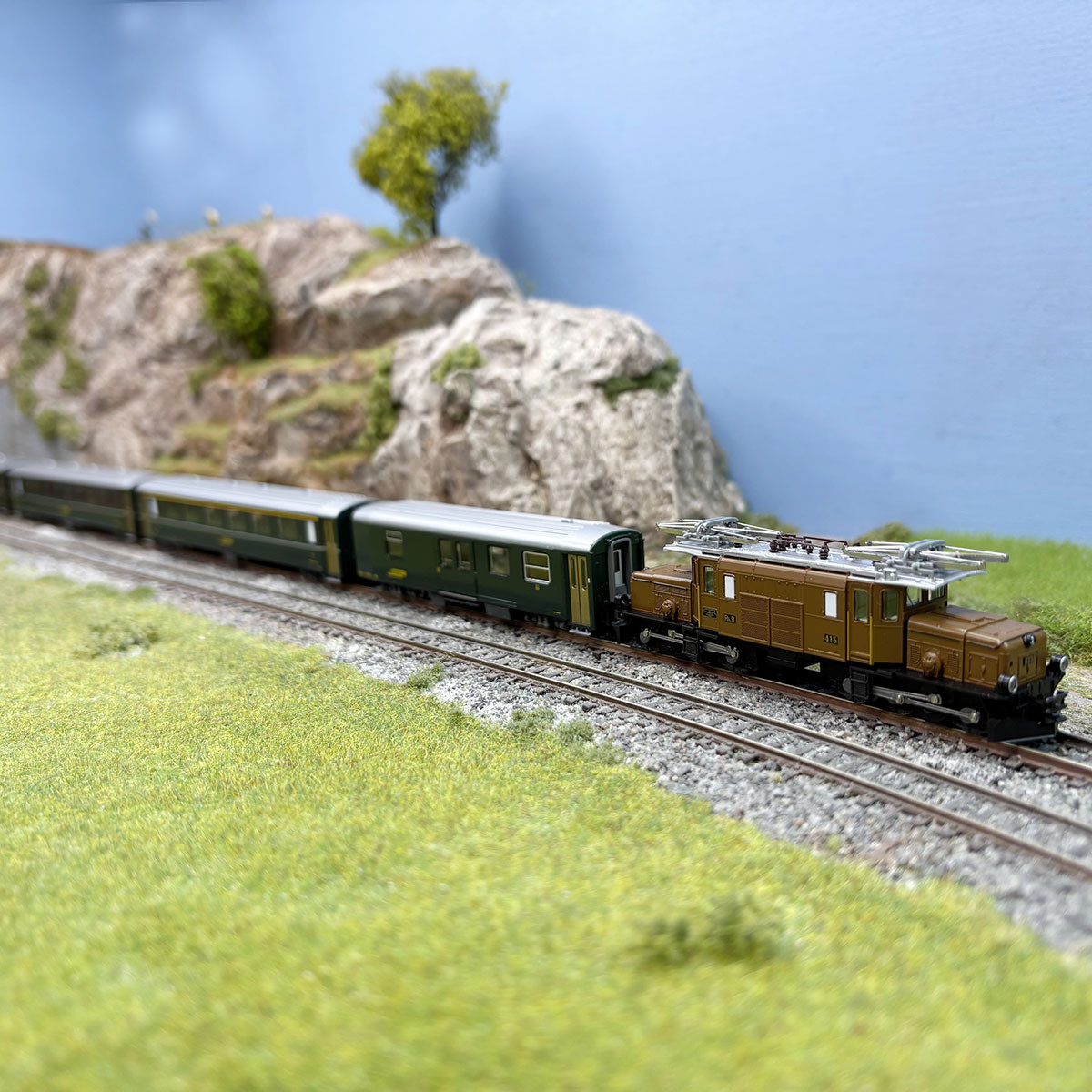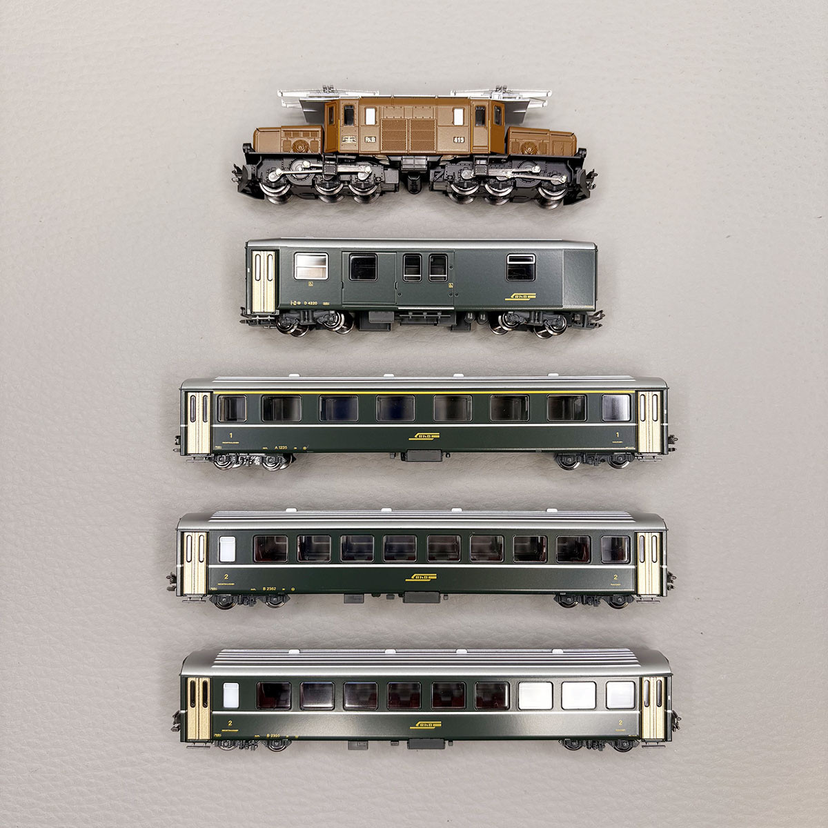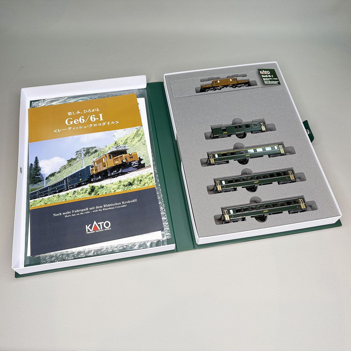 - Modèle réel : Train de voyageurs constitué d'une locomotive électrique Ge 6/6I dite "Krokodil", d'une voiture EW I, 1ère classe, de deux voitures EW II, 2ème classe et d'un fourgon à bagages. Ce train était utilisé par la société des chemins de fer suisse RhB. 21 locomotives ont été achetées par le RhB. L'état de service représente le début des années 1980.
