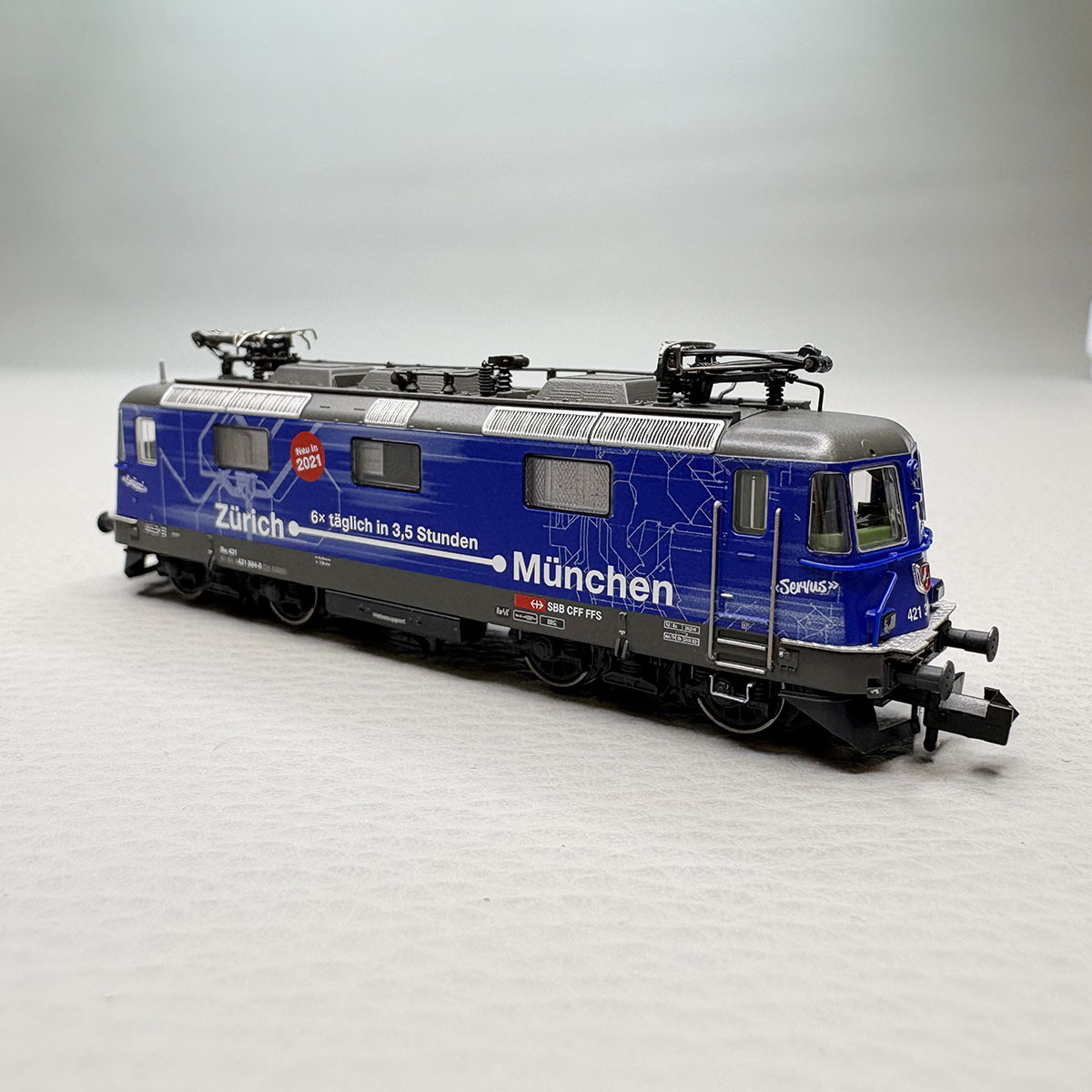 La raison en est l'écart d'électrification dans la section de la Deutsche Bahn entre Geltendorf et Lindau.Pour attirer l'attention sur ce point, la Personenverkehr CFF a doté quatre de ses machines Re 421 d'un habillage publicitaire bleu foncé.Les locomotives circulent de préférence avec des trains de voyageurs.