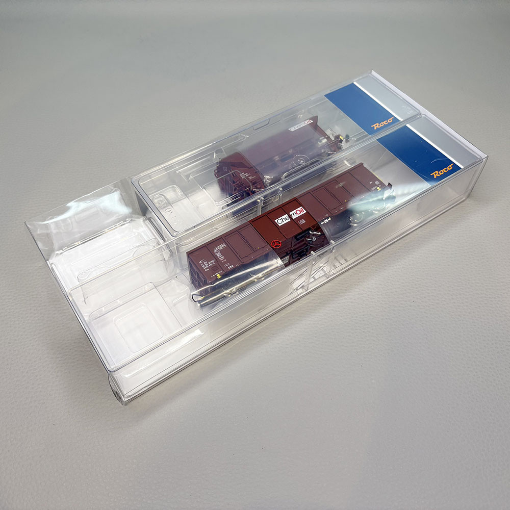 - Modèle réel : Après 10 ans de service, ces wagons peuvent être encore aperçus sur le réseau Suisse. Un wagon tombereau à bogies de type Eas et un wagon trémie à déchargement automatique de type Fcs de la société "CHEMOIL".
