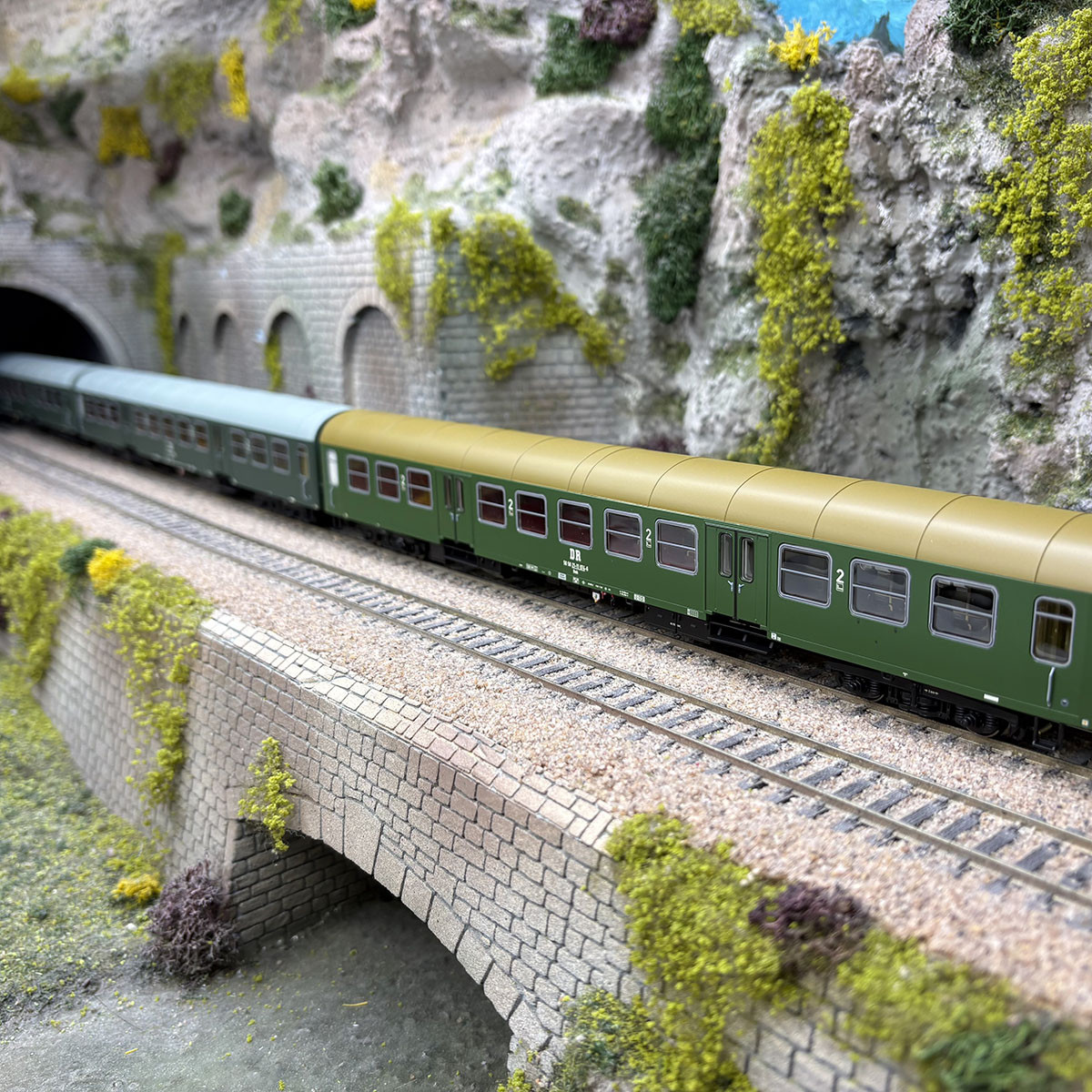 - Modèle réel : Voiture voyageurs de type Bmh à accès central de Halberstadt, utilisée pour les grandes lignes par la société des chemins de fer allemand DR. Livrée et mise en service fin des années 1980.