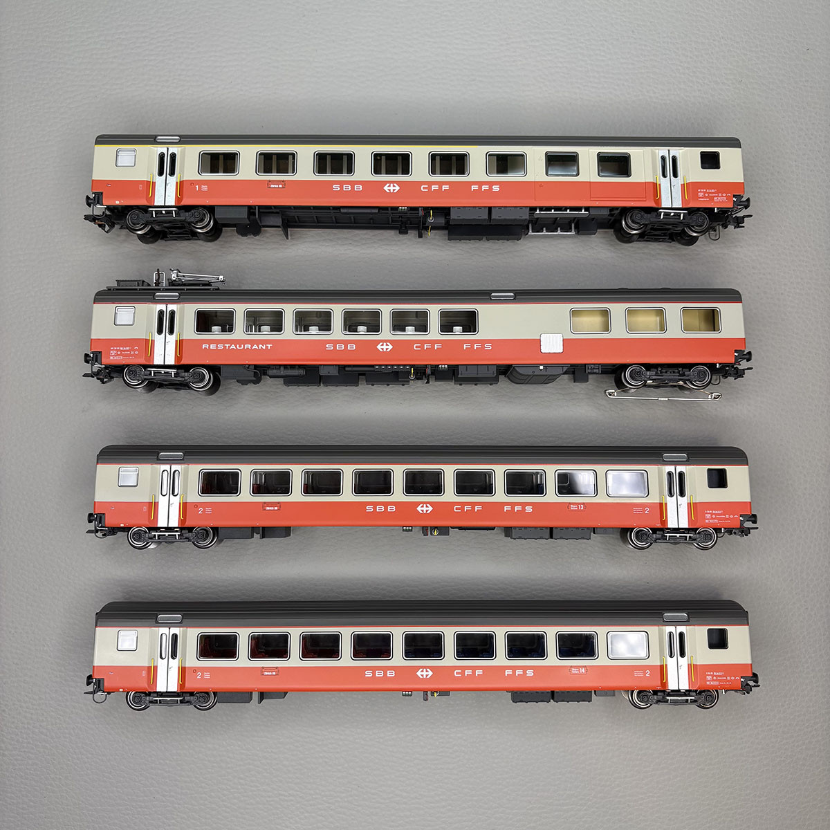 - Modèle réduit : Ces wagons à l'échelle H0 de la compagnie des chemins de fer CFF, est reproduit à l'état de fonctionnement époque IV. Conçue pour le système à courant alternatif 3 rails, AC. Avec aménagement intérieur, éclairage intérieur et feux de fin de convoi.