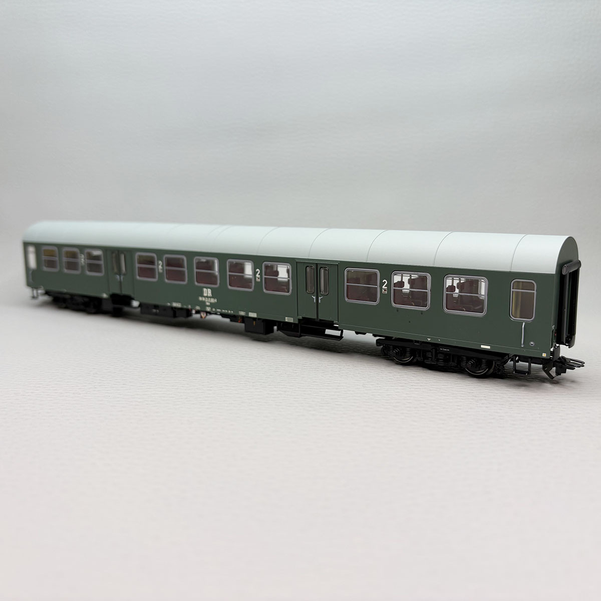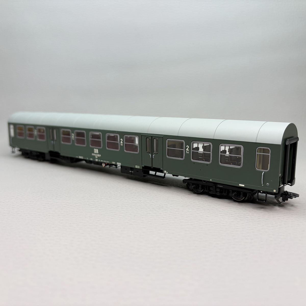 - Modèle réel : Voiture voyageurs de type Bmh à accès central de Halberstadt, utilisée pour les grandes lignes par la société des chemins de fer allemand DR. Livrée et mise en service fin des années 1980.