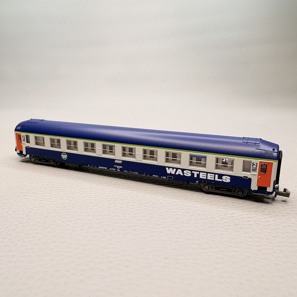 - Modèle réduit : Cette voiture à l'échelle N de la Société SNCF, est reproduit fidèlement. Conçue pour le système à courant continu 2 rails, DC. Avec aménagement intérieur. Logo encadré blanc. Toit haut, livrée Wasteels, cartouche Corail, bogies Y16.