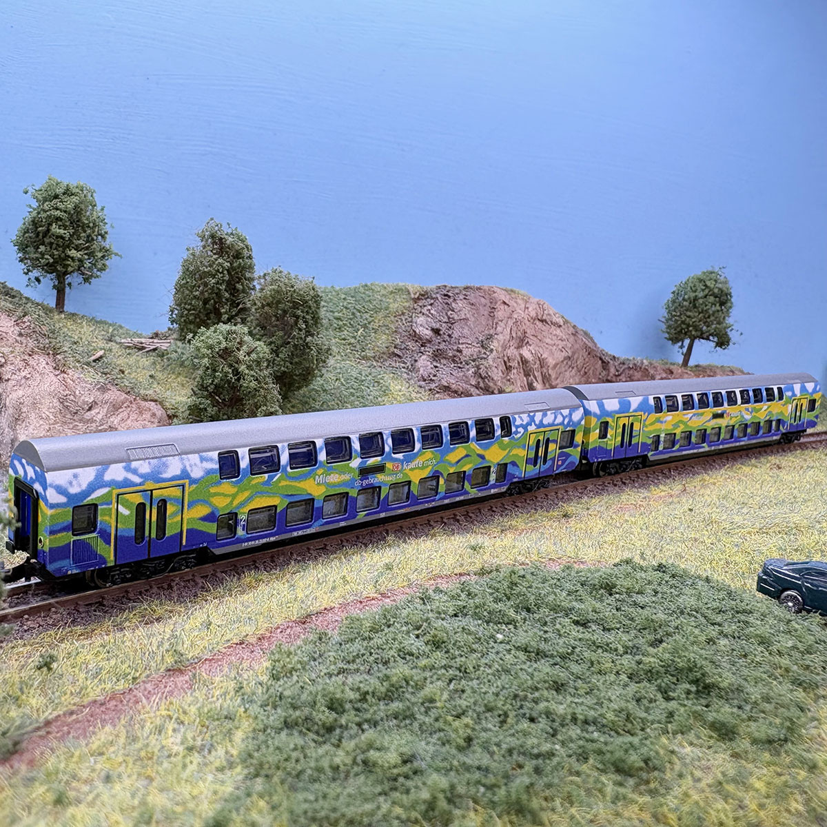 2 voitures voyageurs 2 niveaux type DBpza 753.5 et DABpza 758.5, livrée "touristique", DB