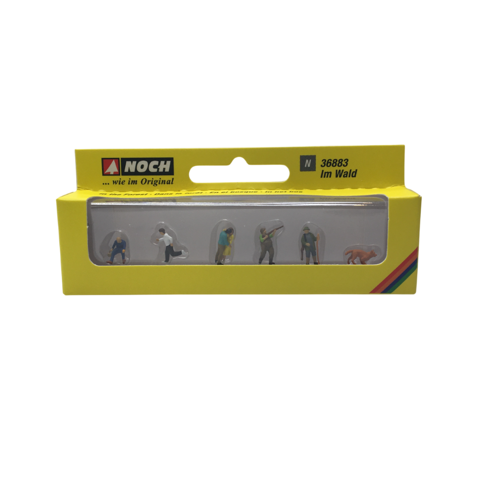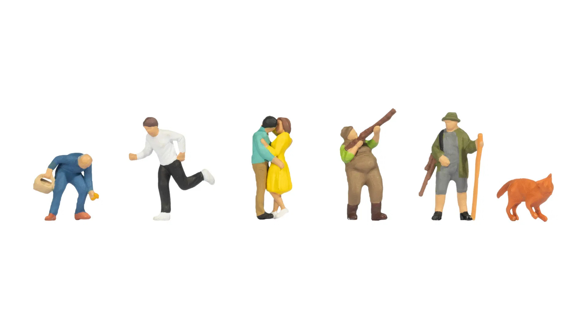 5 figurines, 1 animal, peints à la main pour modélisme ferroviaire et diorama.