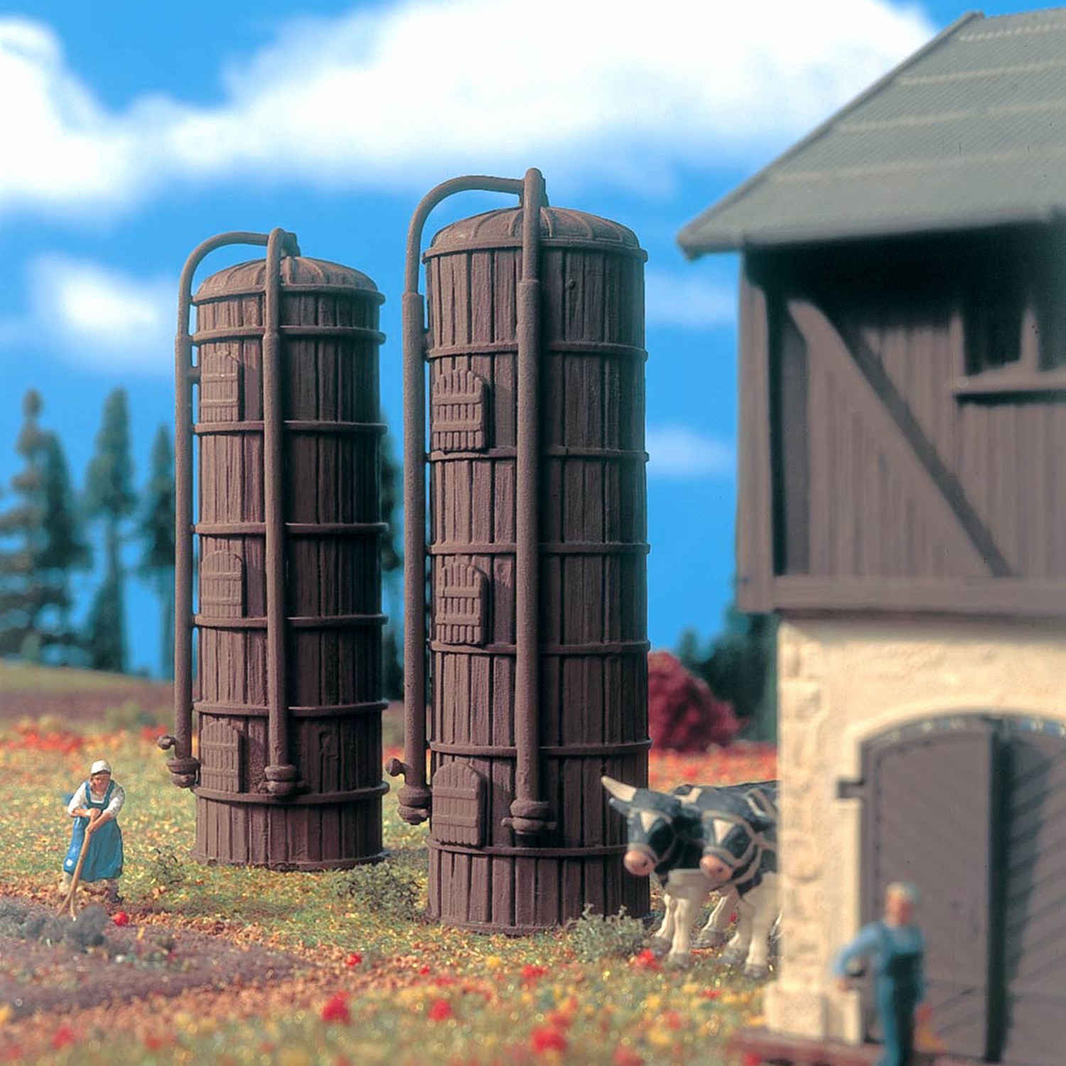 2 silos en bois avec cerclage de métal pour votre ferme, pour diorama et modélisme ferroviaire.