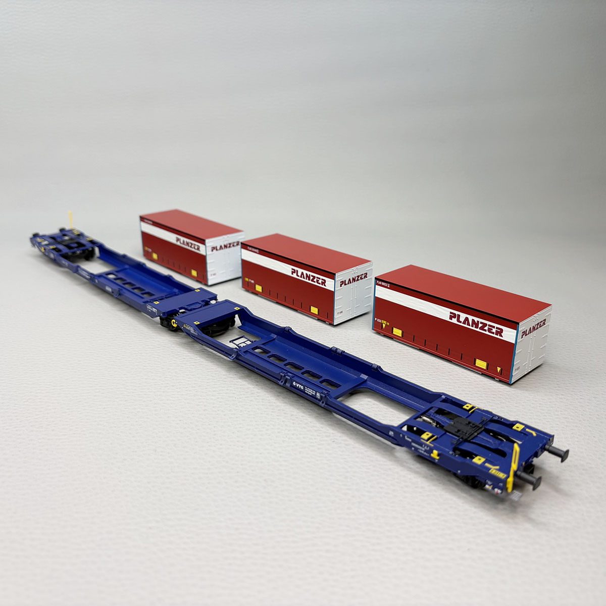 - Modèle réel : Wagon double poche type S629 / T3000e est une amélioration du T2000, il peut accueillir des conteneurs ou des remorques semis. Version utilisée par la compagnie des chemins de fer allemand VTG AG.