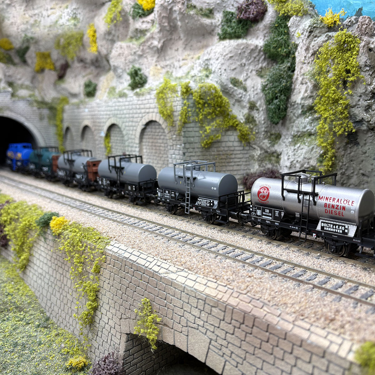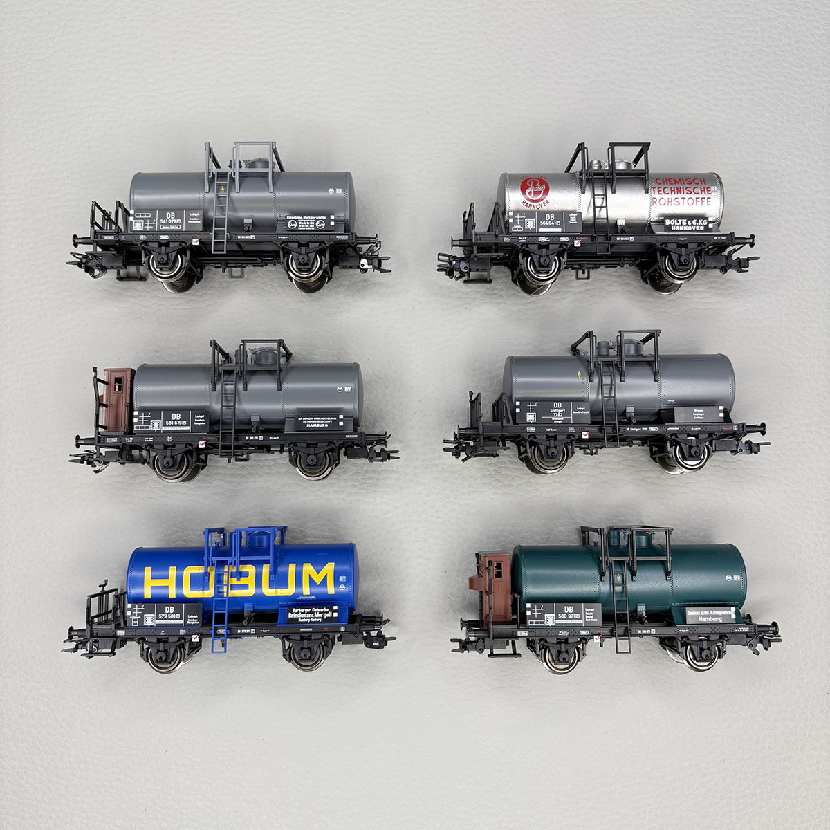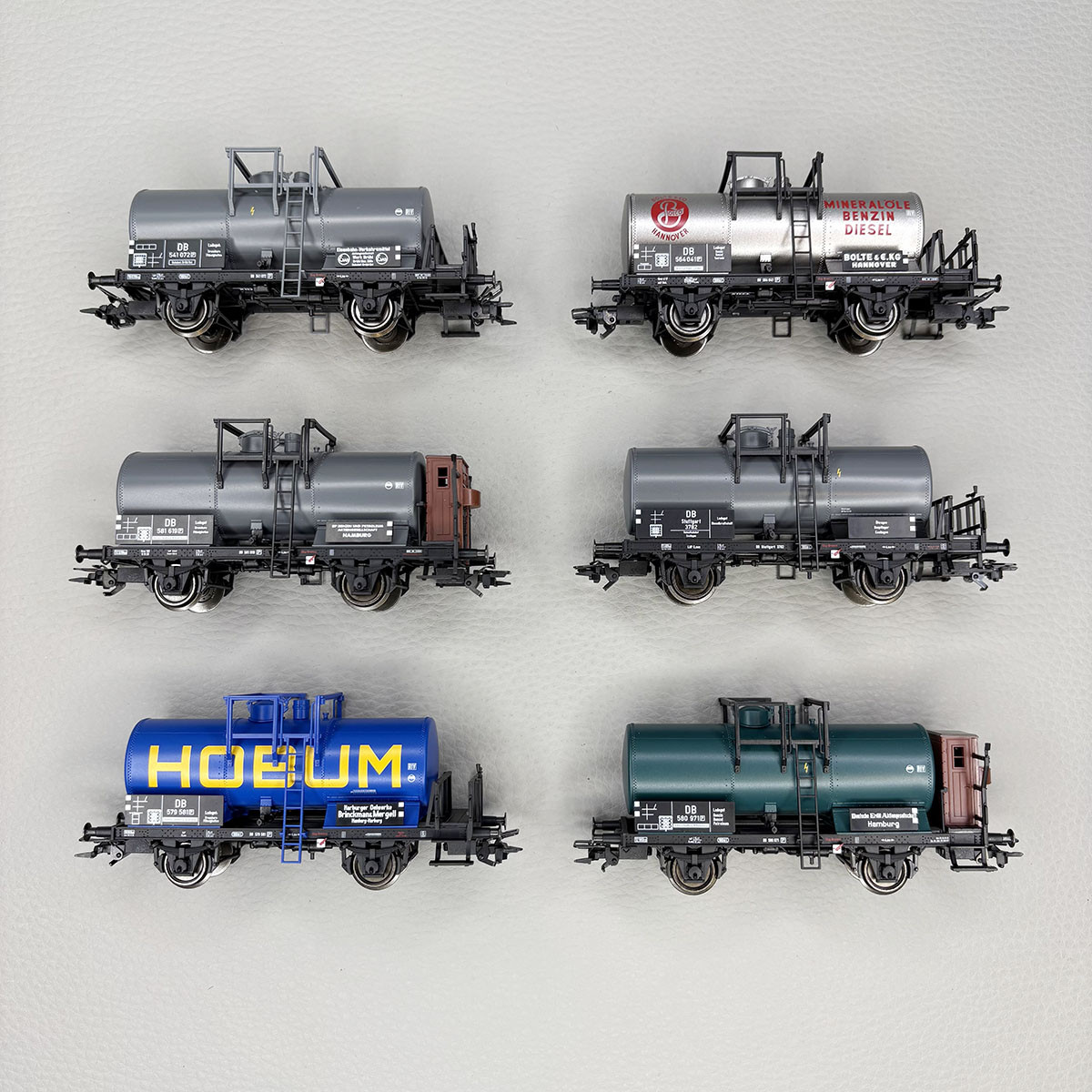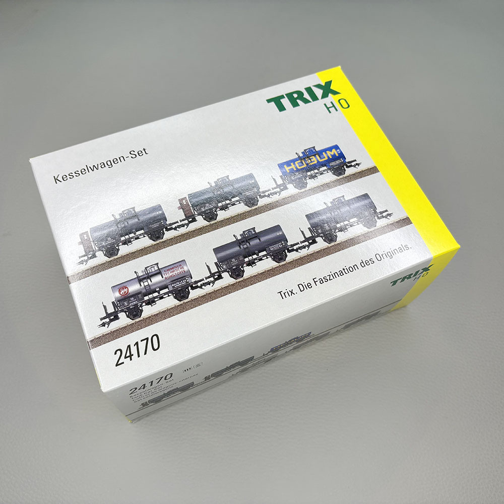 6 wagons citernes courts, 2 essieux, "BP, DEA, HOBUM, EVA, BOLTE",DB, Ep. III - TRIX 24170 - HO 1/87
