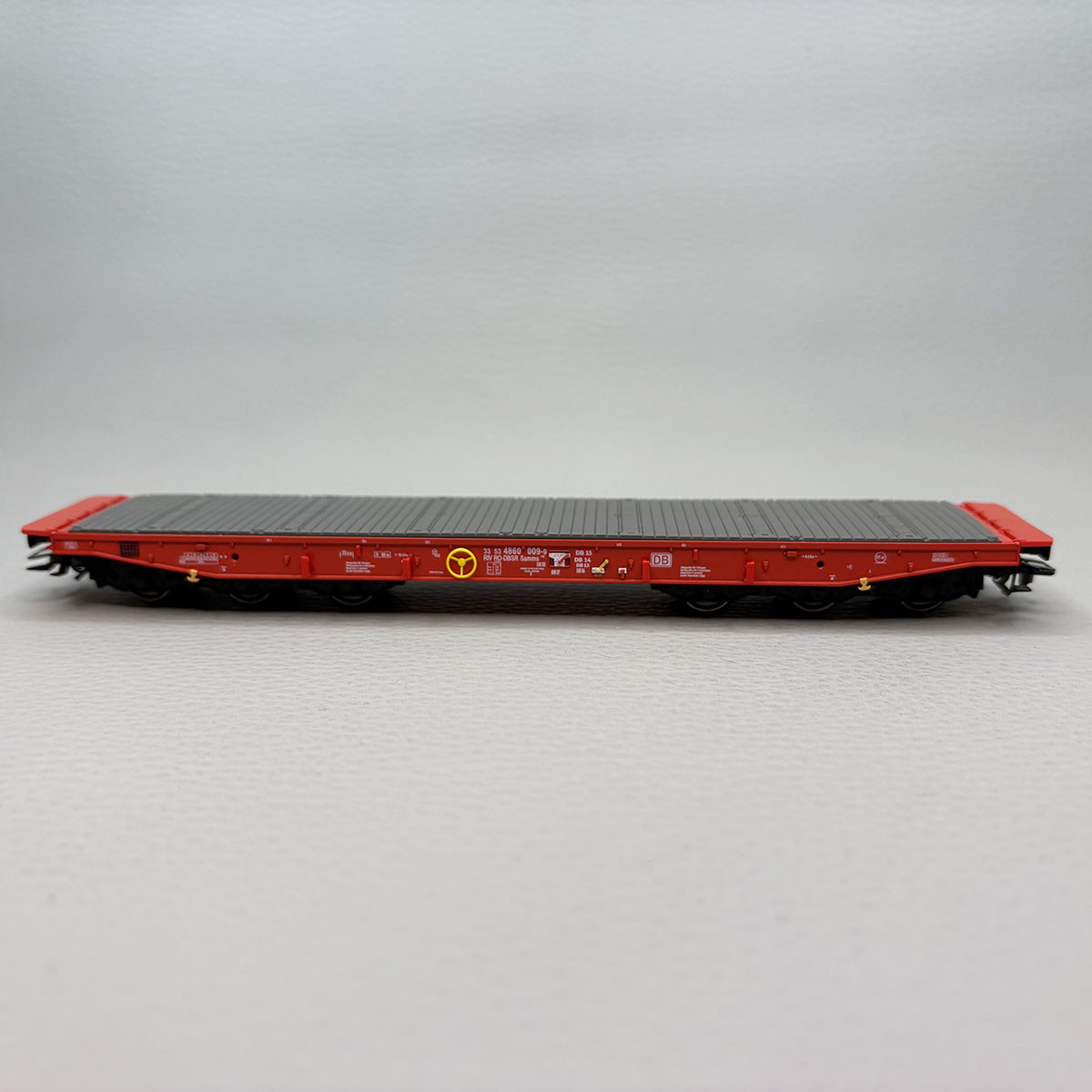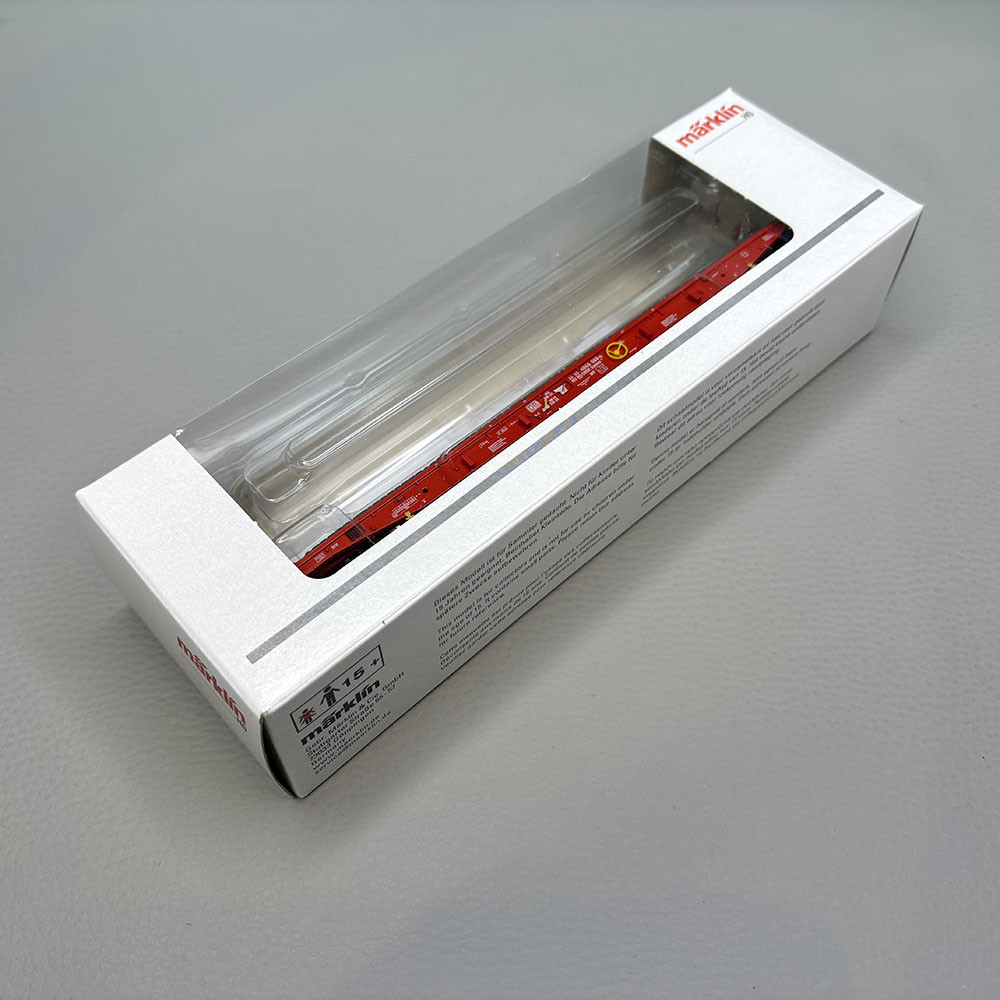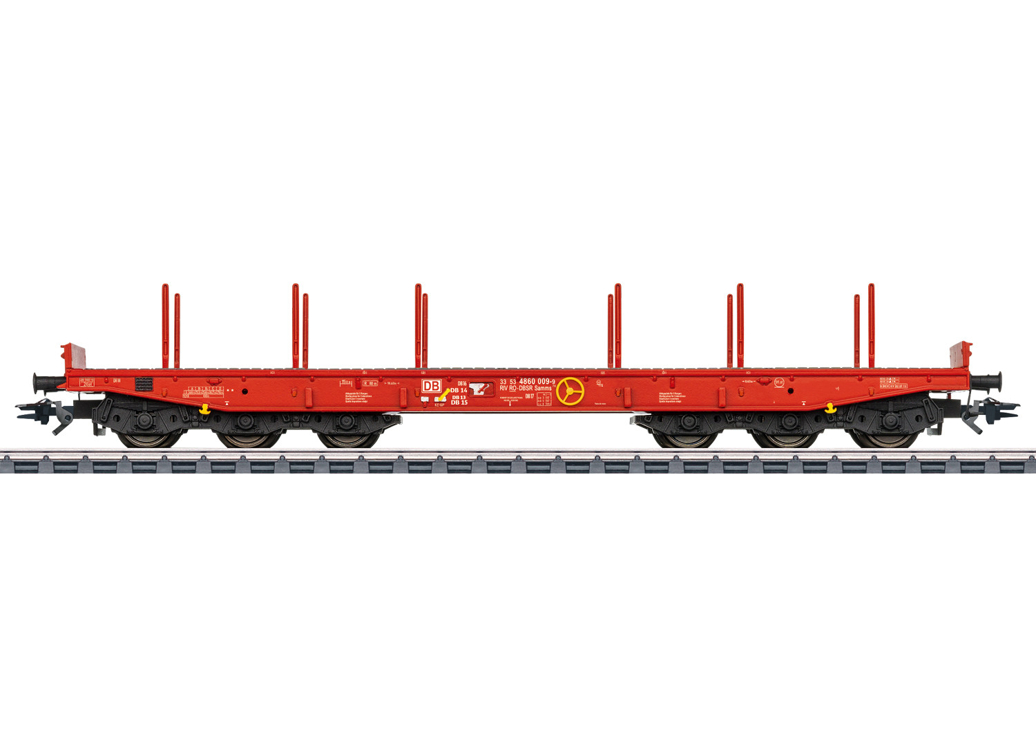 - Modèle réel : Wagon plat à ranchers de type Samms 710, équipé de bogie à 3 essieux. Utilisé pour le transport de charges lourdes. Livrée rouge trafic des chemins de fer allemand DB AG.