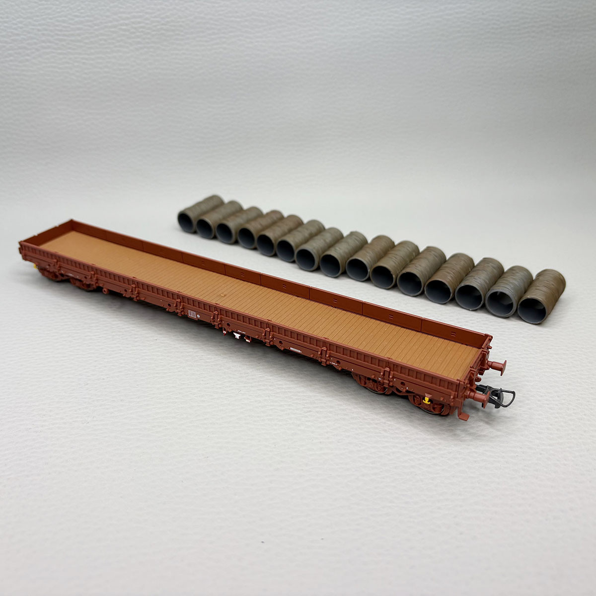- Modèle réel : Wagon à bogies, plat avec ridelles et ranchers de type Res utilisé pour le transport de marchandises diverses. Appartenant à la société des chemins de fer français SNCF. Modèle présenté avec chargement de bobines d'aciers.