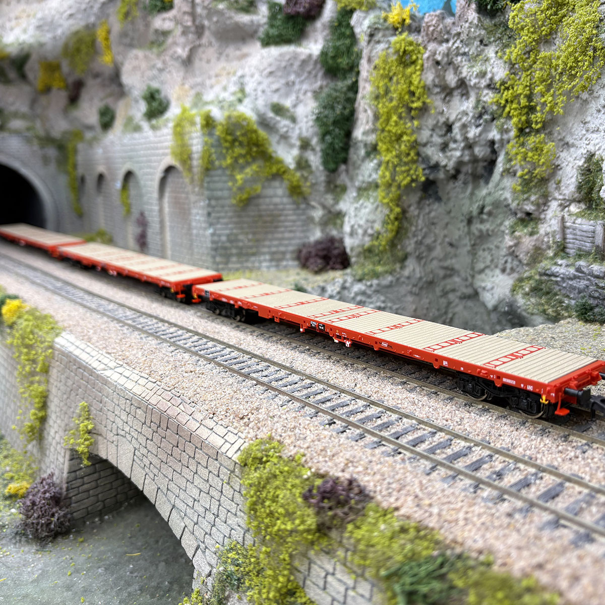 - Modèle réel : Wagon plat à ranchers de type R, livrée en version RCW, rouge. Utilisé par la compagnie des chemins de fer fédéraux autrichienne ÖBB sous la gamme Rail Cargo Wagon.