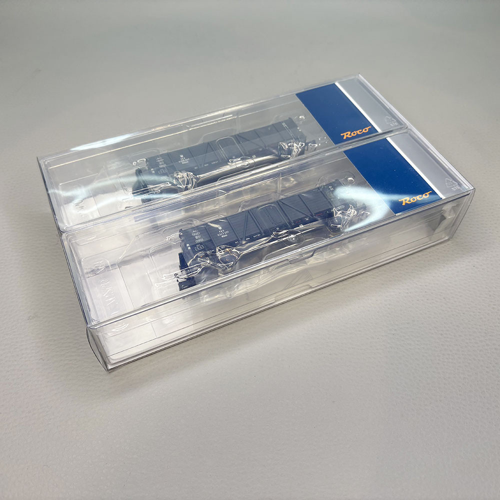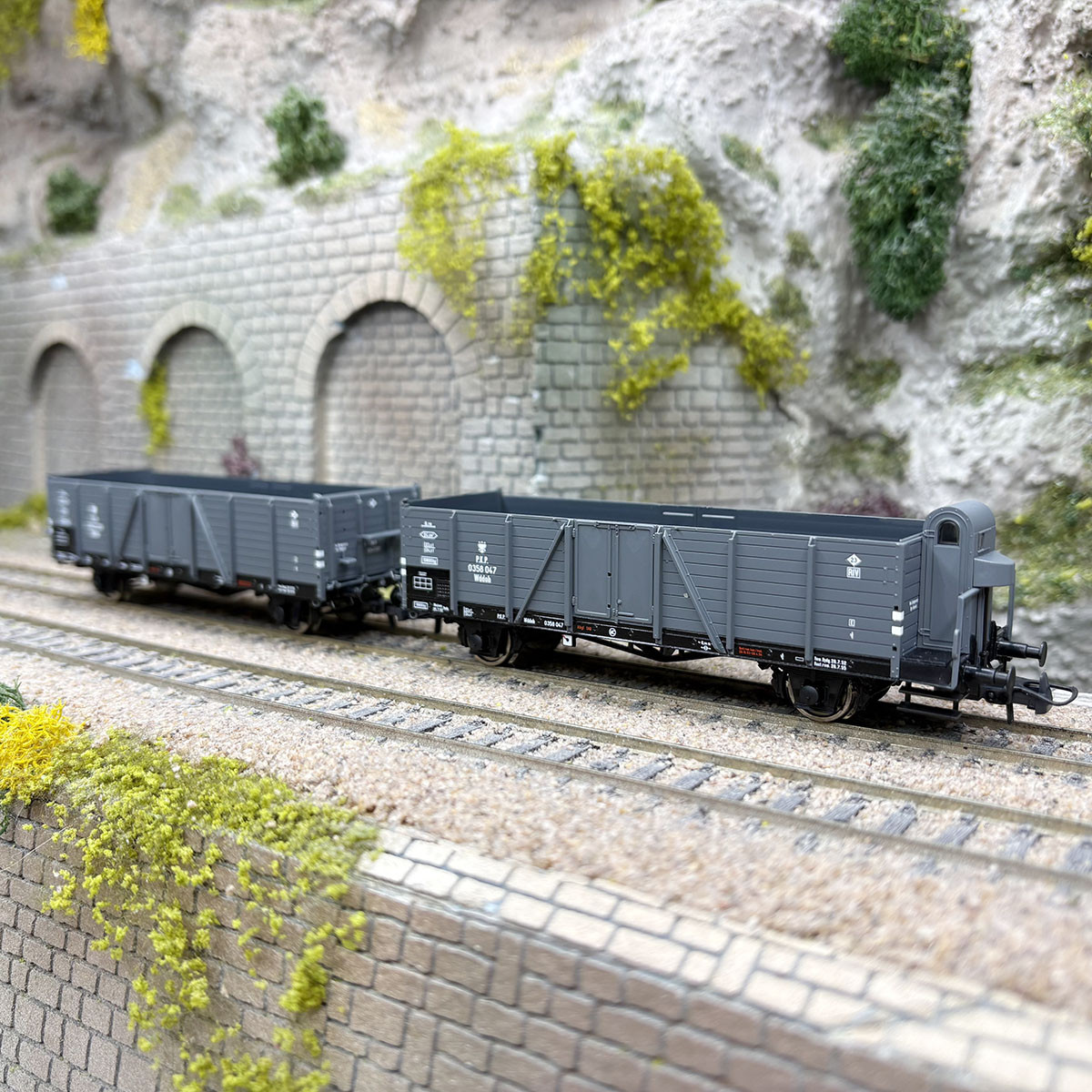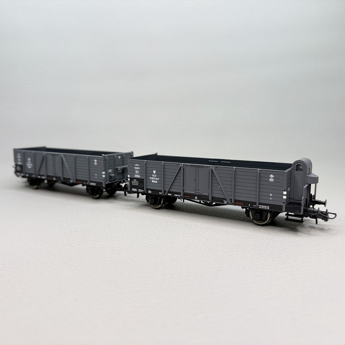 Modèle réel :Tombereau à deux essieux utilisé par les chemins de fer polonais PKP pour le transport de marchandises ne craignant pas les intempéries. Un tombereau de type Wddo sans cabine de freinage et un autre de type Wddoh avec cabine de freinage.
