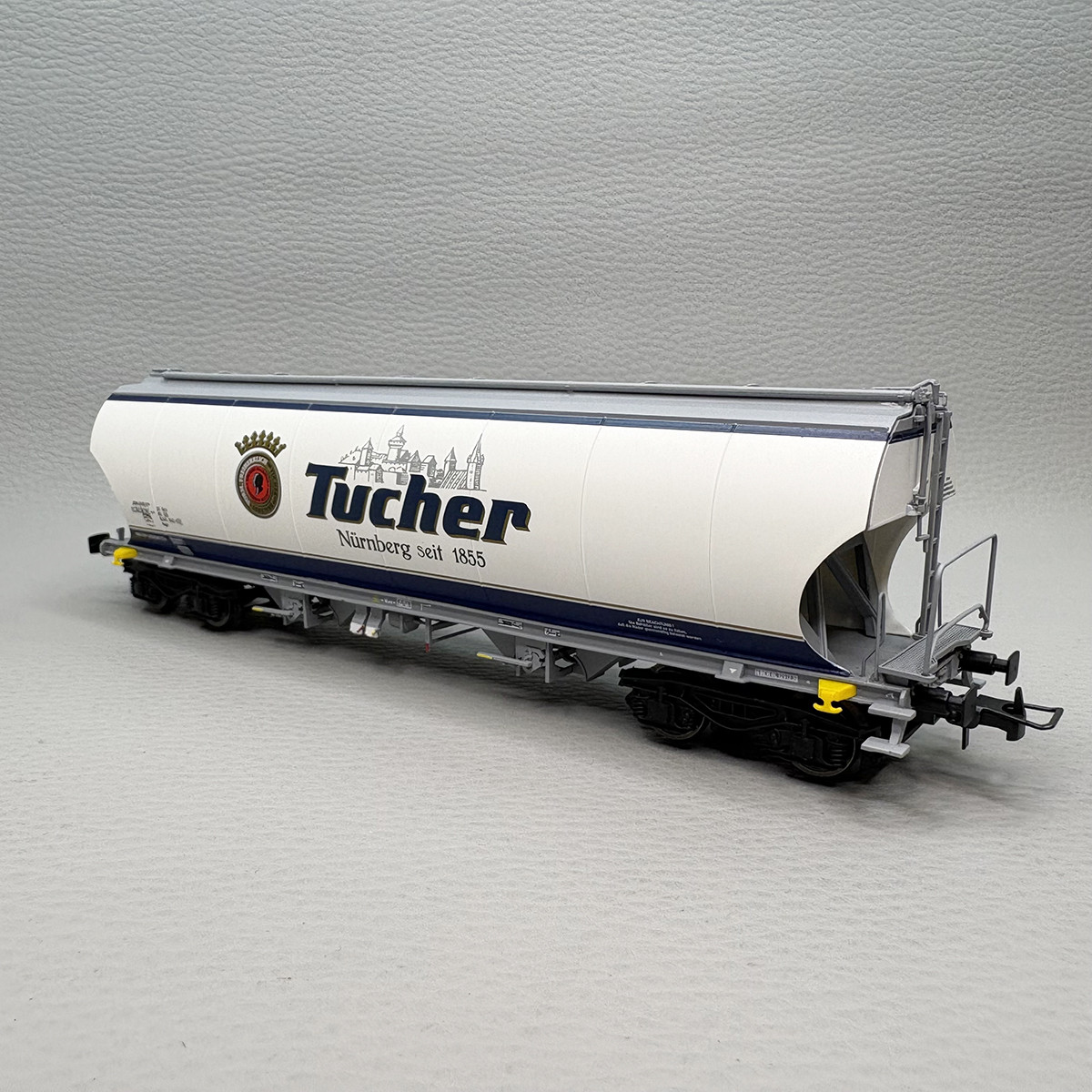 - Modèle réel : Ce wagon type Uagps est utilisé pour le transport de céréales principalement. Affecté à la société des chemins de fer allemand DB. Livré avec publicité bière "Tucher".