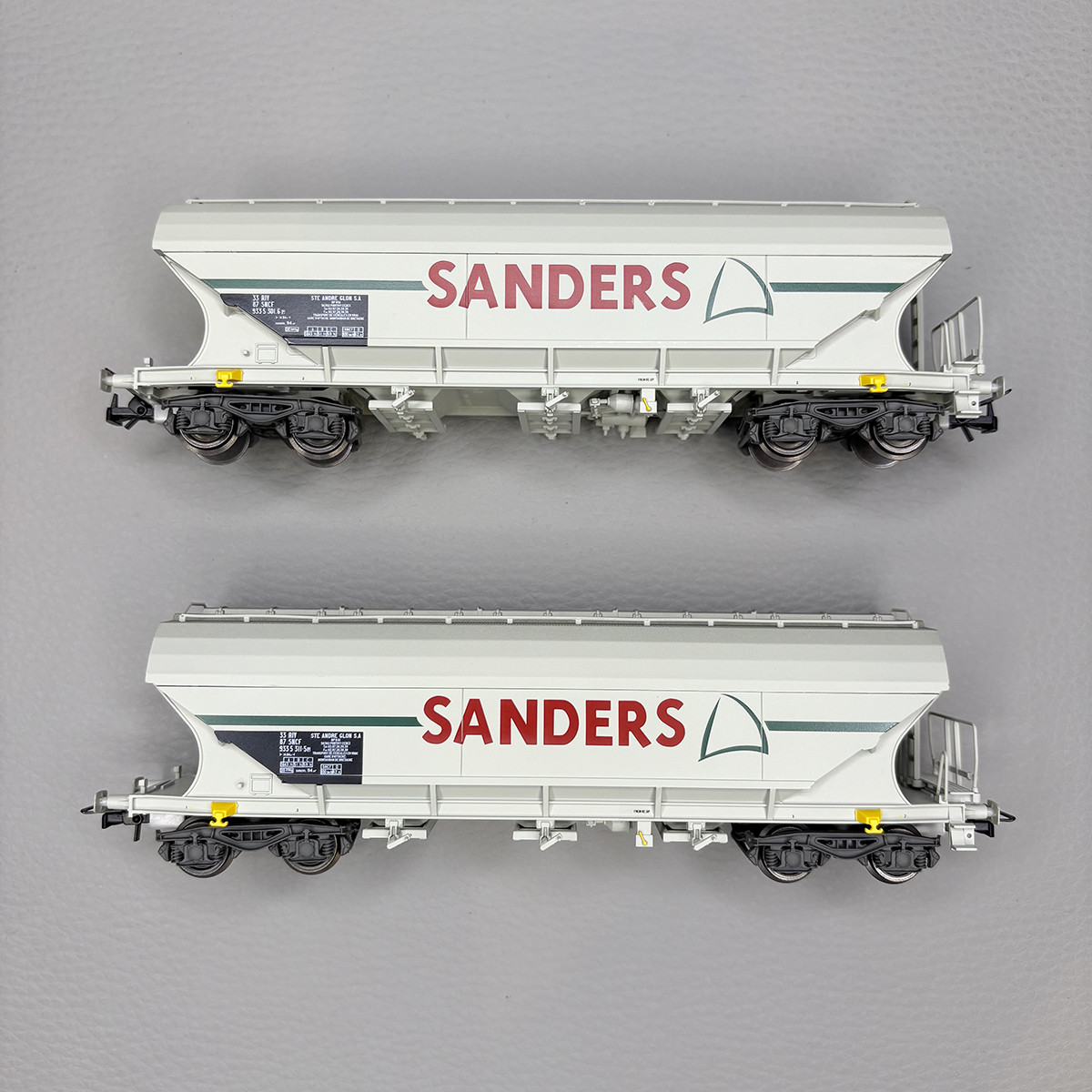 - Modèle réel : Ce wagon type céréaliers est utilisé pour le transport de céréales principalement. Affecté à la société Sanders et immatriculé par la société SNCF. Livré grise.